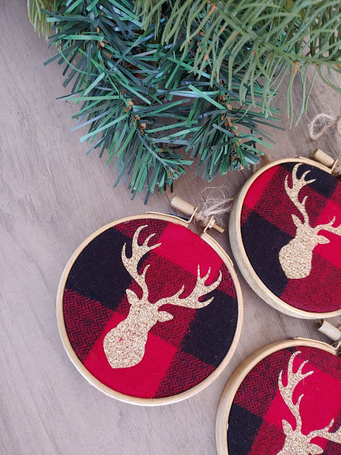 Mini embroidery hoop ornaments: these are another sewing free option for fabric scraps and make great gifts! You can easily personalize them with vinyl or paint and they would also make a fun girls craft night project. I am linking my tutorial to making these fun ornaments here for you!