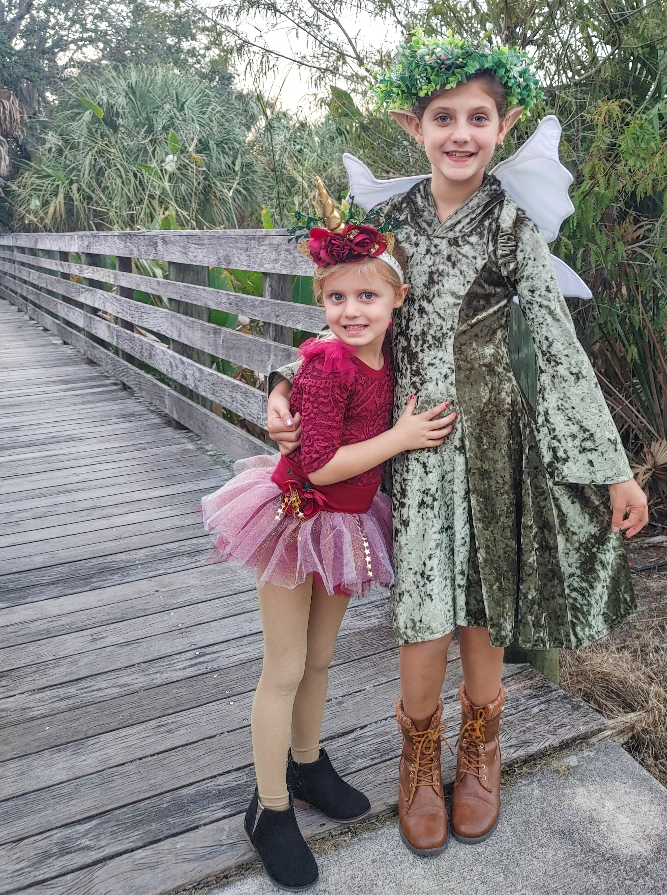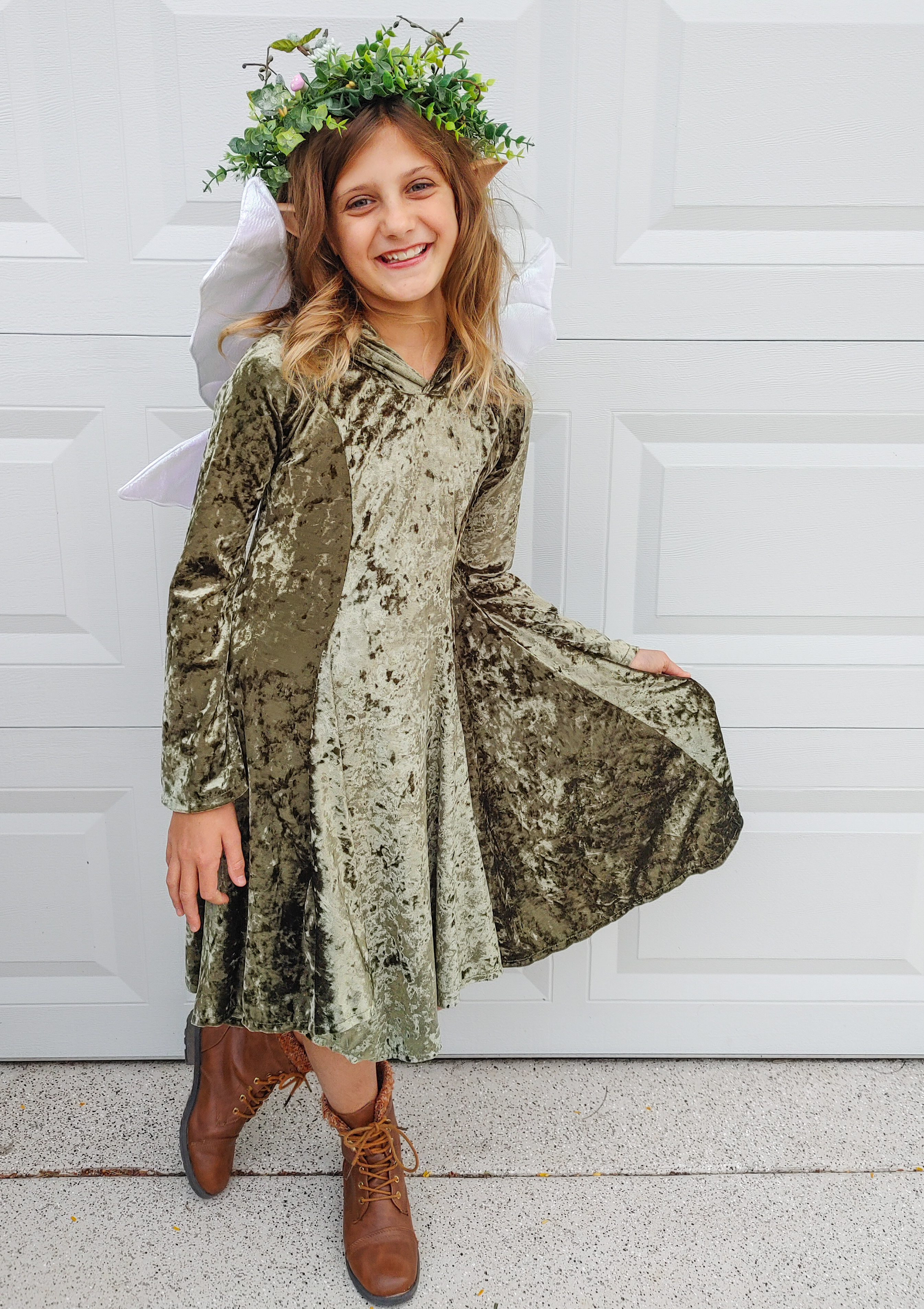 Next, my nine-year-old chose a pixie as her costume. I was able to test out the new Raven pattern from Boo & Lu Patterns several weeks ago and knew instantly it would be an amazing pixie dress in an earth toned crushed velvet. I found a dusty olive crushed velvet from Knitpop that paired beautifully with this pattern. I have been wanting an excuse to sew up some wings from Twig and Tale for years so I jumped on the opportunity to finally buy their Woodland Sprite Wings pattern. I used the medium sized wings and couldn’t believe how much easier they were to sew up than I expected! I did slightly modify these wings to add wire into the top portion of the wings only to help retain their shape better as I used a thinner fabric than the pattern recommended. While they are not difficult they are time intensive so be sure to allow yourself ample time to put these together carefully and properly. Her floral crown was so fun to make as well and I love my daughter’s idea to add mushrooms and butterflies (both found on Amazon) into the crown for even more woodland whimsy!