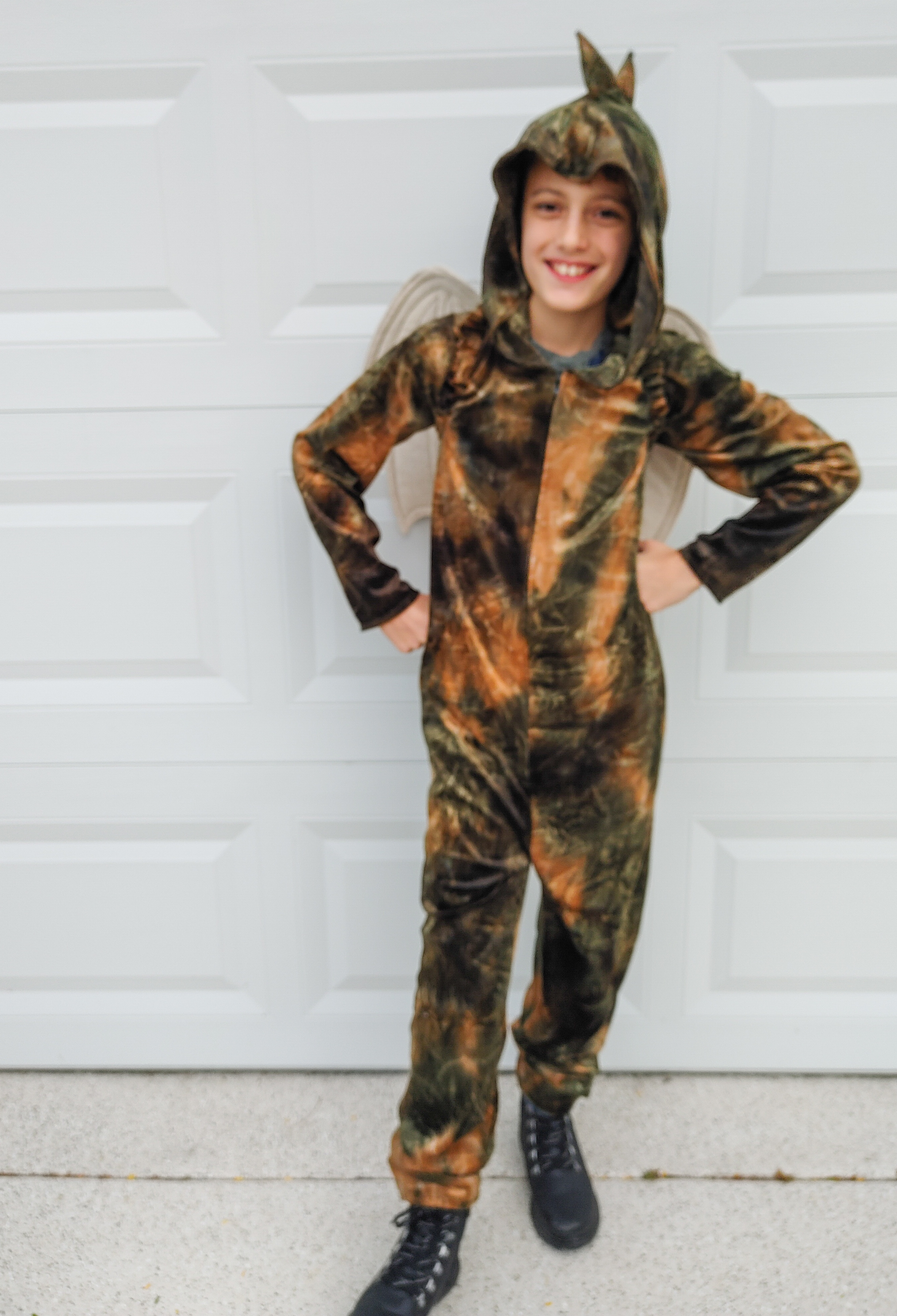 My son was excited about his choice of dragon and even convinced me to sew up a matching dragon costume for our pup! I found this really fun crocodile embossed camo-look fabric in the Halloween fabrics at my local Joann store and he loved it for his costume. For this look I decided to use the Ultimate Costume Creator from Peekaboo Pattern Shop. I was intimidated about the zipper installation but it was actually super easy and had great instructions for installment. I did find the pattern ran a little big even when using his measurements but he didn’t mind and will get to wear it for dress up for a longer time. He declined the back spikes as he wanted to wear dragon wings instead so I only attached spikes to the hood portion of the costume. For his wings I used the Twig and Tale Dragon Wings in the medium size and also ordered the Mini Size for our dog’s costume. These wings turned out incredible and just made his costume! When sewing the mini size for my dog I decided to pair them with a Pet Movie Night Shirt (a FREE pattern!) from Sew A Little Seam. For the back piece, I cut mirrored pieces (with seam allowance added) instead of on the fold so that I could attach the wings inside this back seam. They made the cutest combo and I love what a good sport with our silly shenanigans our little Yorkie is!