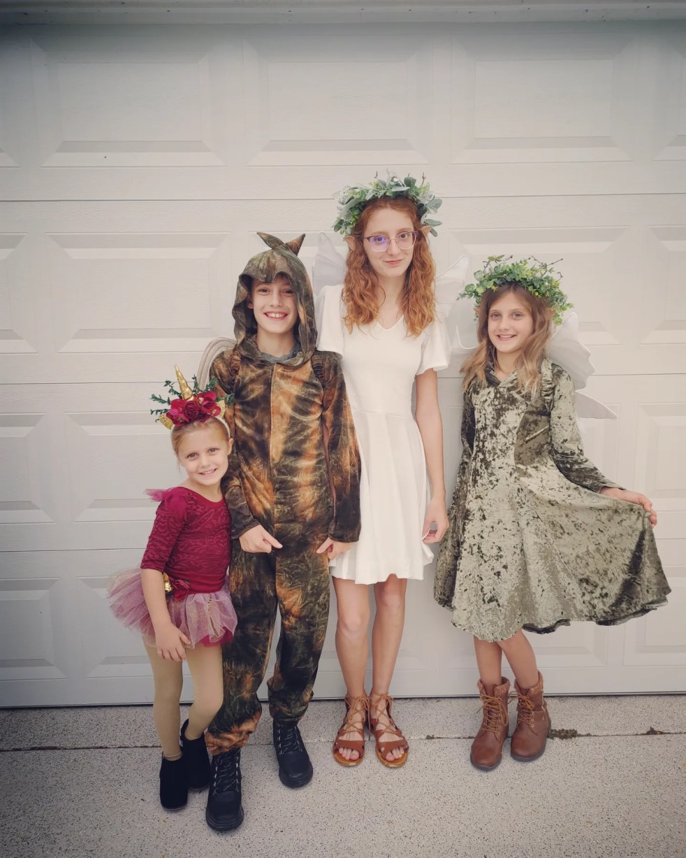 My family does themed Halloween costumes every year and our kids wanted to be mythical woodland creatures this year!  I am so excited to share these makes with you all! I absolutely love the theme we picked and loved bringing each vision to life.   We chose pixies, dragons and unicorns as the creatures they wanted to dress up as.