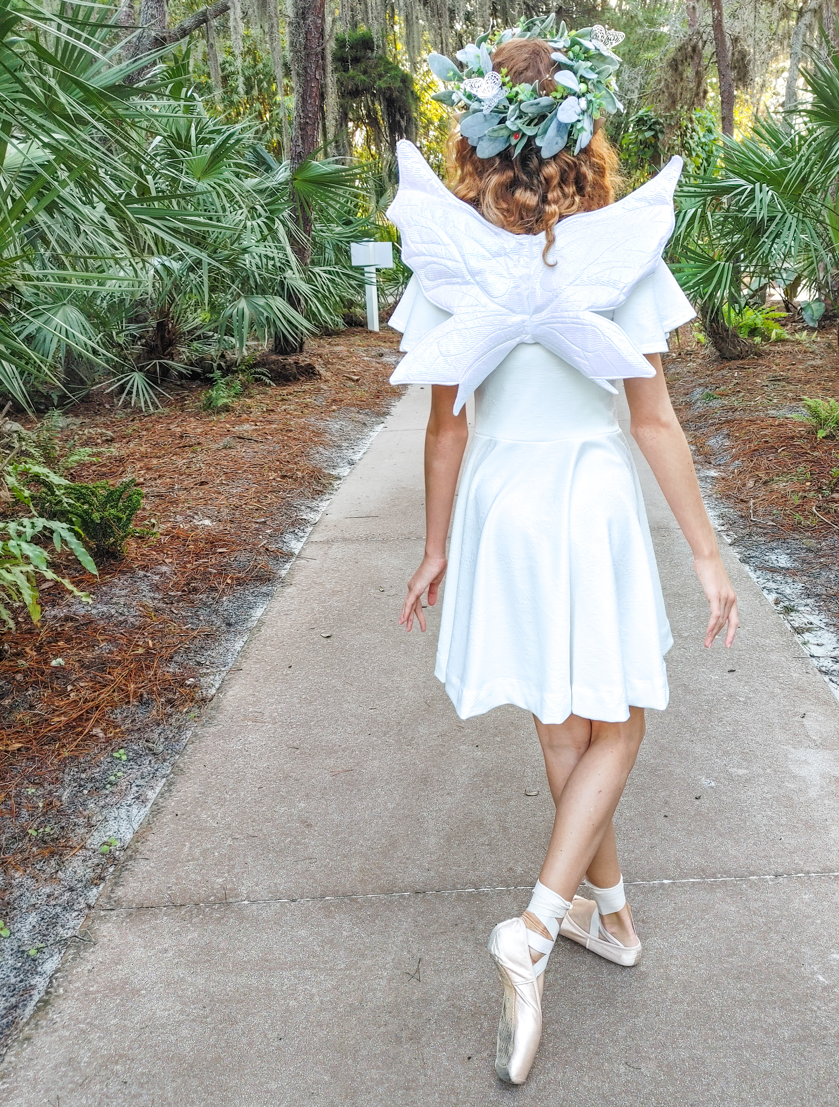 Finally, my oldest also wanted to dress up as a pixie this year but wanted a totally different look than her sister. She had a vision for an all white dress in a full circle skirt with full fluttery sleeves. I found the most gorgeous embossed jacquard knit on sale from Surge Fabrics that made the perfect twirly dress. For her costume I used the Sorrel pattern with FREE circle sleeve add-on modified to have a deep 2″ hem. I sewed up a second pair of Woodland Sprite Wings in the medium sized as well (she wanted her wings on the smaller size) and also added the same wire modification to hers. She watched me make her sister’s floral crown and wanted to make her own without my help. I have to say that it turned out so pretty and I am quite impressed with her skills! Her costume turned out SO elegant, graceful and magical.