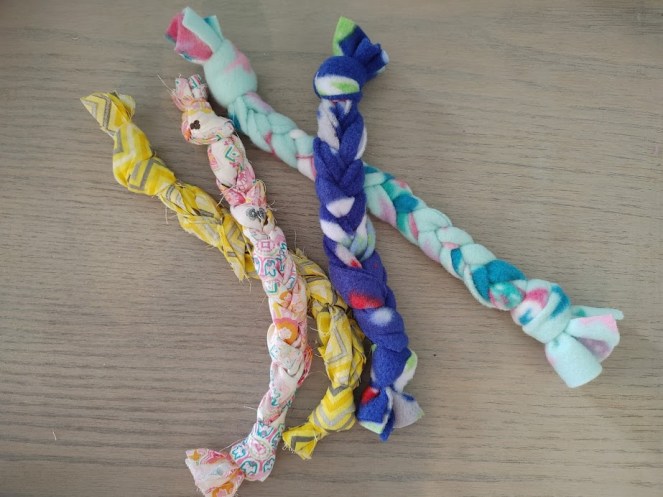 Braided rope dog toys: My kids participated in a children’s craft fair recently and wanted to sell dog toys. We cut up scraps of fabric and braided them into pull toys. This is a GREAT kids craft and is a sewing free project. When we made these, we used fleece and quilting cotton scraps. The fleece is preferred as the cotton frays but our dog plays with both! For the cotton ropes we doubled the strands using 6 strips instead of 3. Simply cut out your strips (you can use pinking shears for less fraying), tie a knot at one end, braid and then tie a knot at the other end! You can trim up your ends to be even and there you have a quick, easy , kid friendly craft to make together. We cut our strips 1.5 inches wide by 20 inches long but you can customize this based on your scrap size as well.
