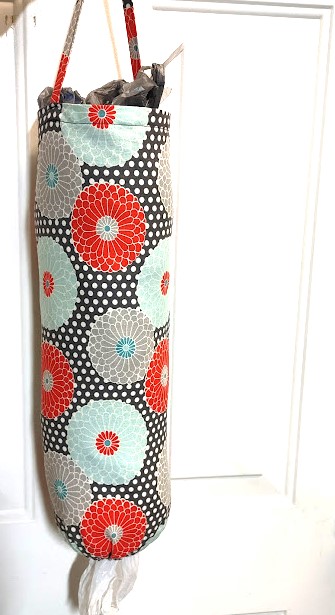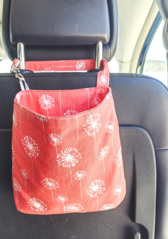 Car trash can: As a mom always on the go with my kids my van is a wreck. I wanted to sew up a mini trash can to help contain the mess. I found a great tutorial from Stitches by Christy that was just what I was looking for. I used scraps of outdoor fabric I had on hand from another project to make this trash holder a bit more sturdy as well.