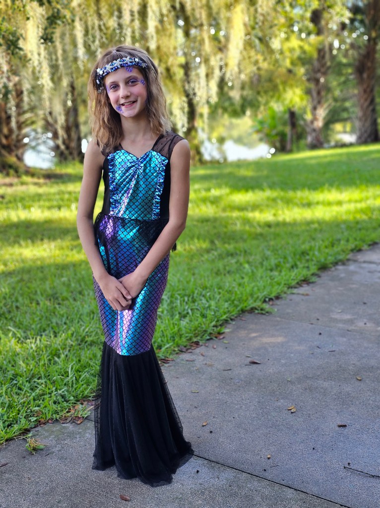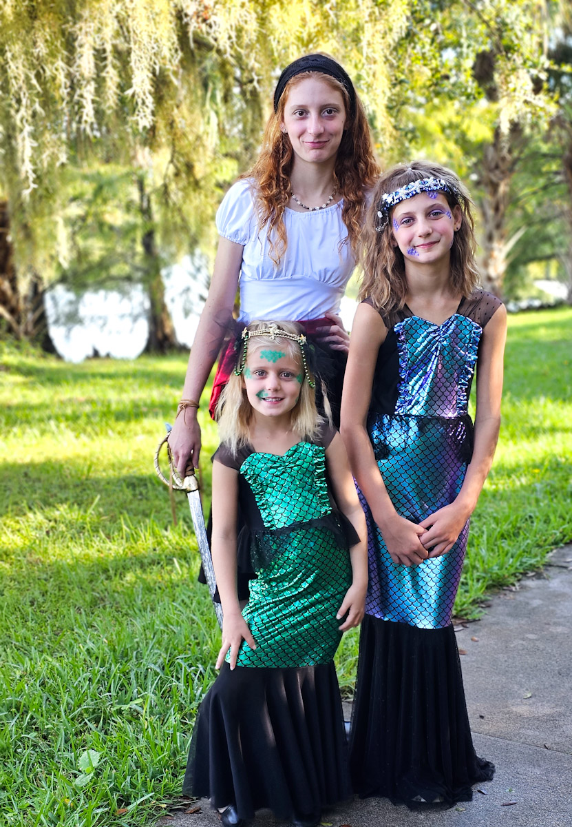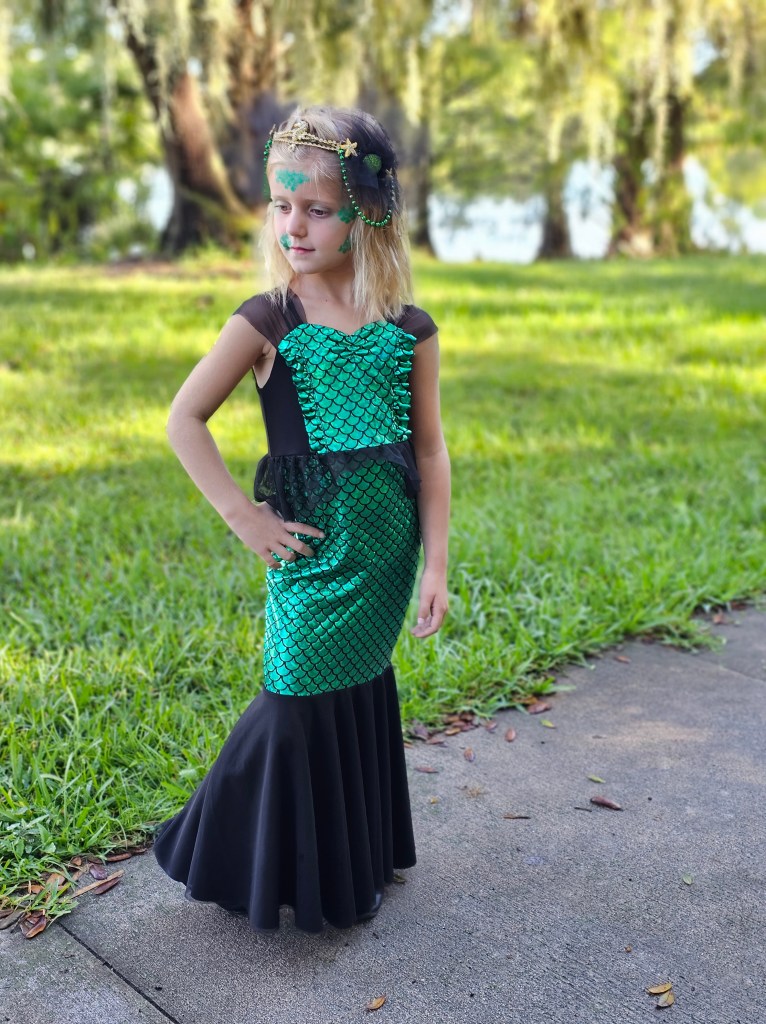 First, I will share the mermaid costumes with you. My two youngest daughters LOVE anything mermaid and magical so this was such a perfect fit for both of them. I used the Sirena pattern from Boo & Lu patterns. This pattern is mermaid perfection, I did not alter this pattern in any way to achieve my daughter’s costumes! We created some over the top mermaid headpieces with face make-up to complete their look.