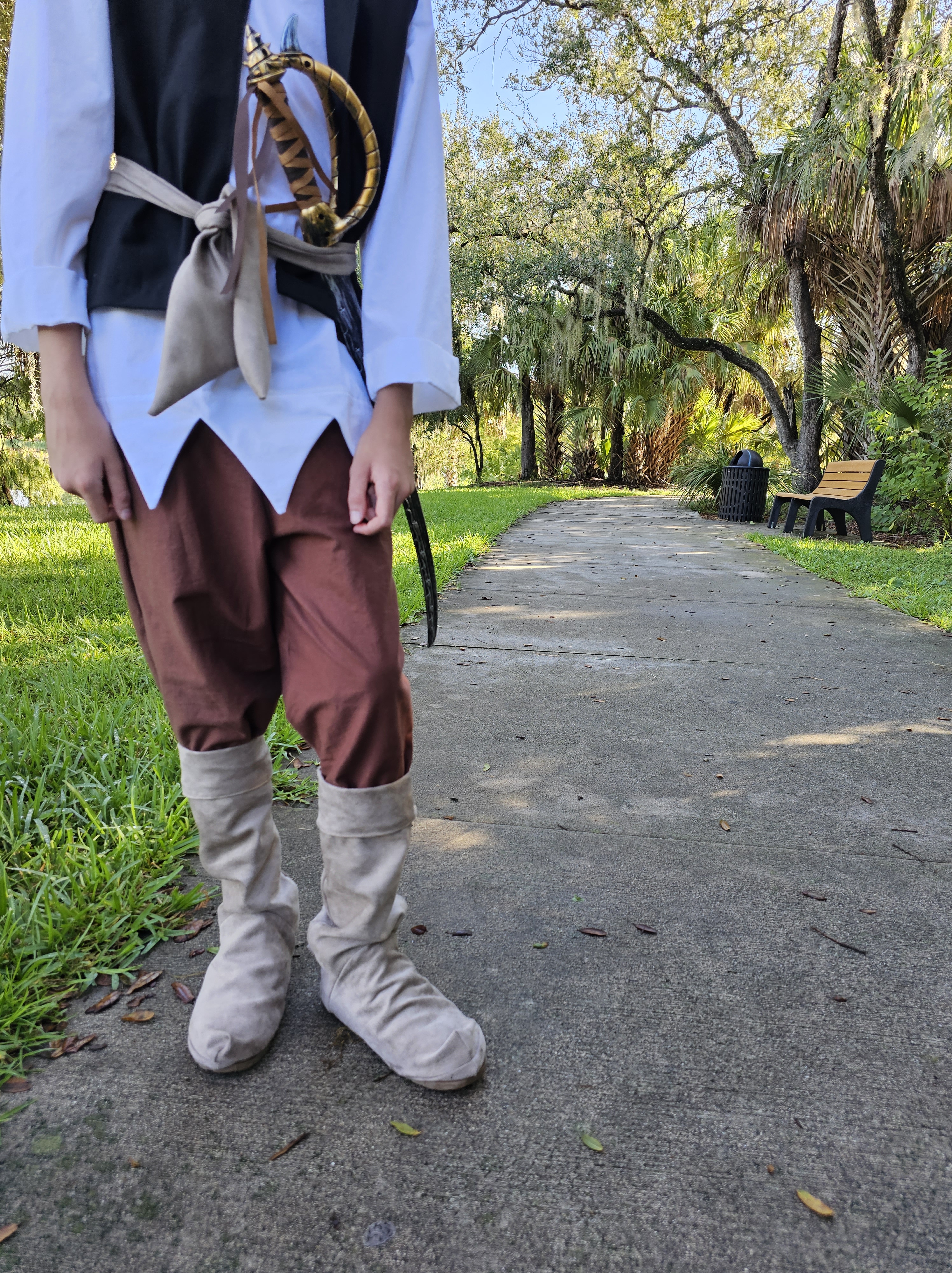 Next, my older two kids wanted to be pirates for Halloween. For my son’s costume I used the Master of Disguise and Imagine patterns from Sew A Little Seam. If you aren’t familiar with the Master of Disguise pattern it is just PACKED with endless costume options. I actually blogged all about this pattern here when it released several years ago. This time I chose the cropped length woven pants, open vest, peasant shirt with zig zag hem and boot covers for his look. I did not modify the pattern for any of these costume pieces. To complete his look he wanted an authentic looking pirate hat so I used the witch hat included in the Imagine pattern but modified it and then used fabric stiffener to get it to really hold the shape. For the hat modification I cut the pointy portion of the hat off and then sewed another circle on top the same circumference as the hat opening. I then sewed up a quick self-drafted belt and head sash to tie together his pirate look.