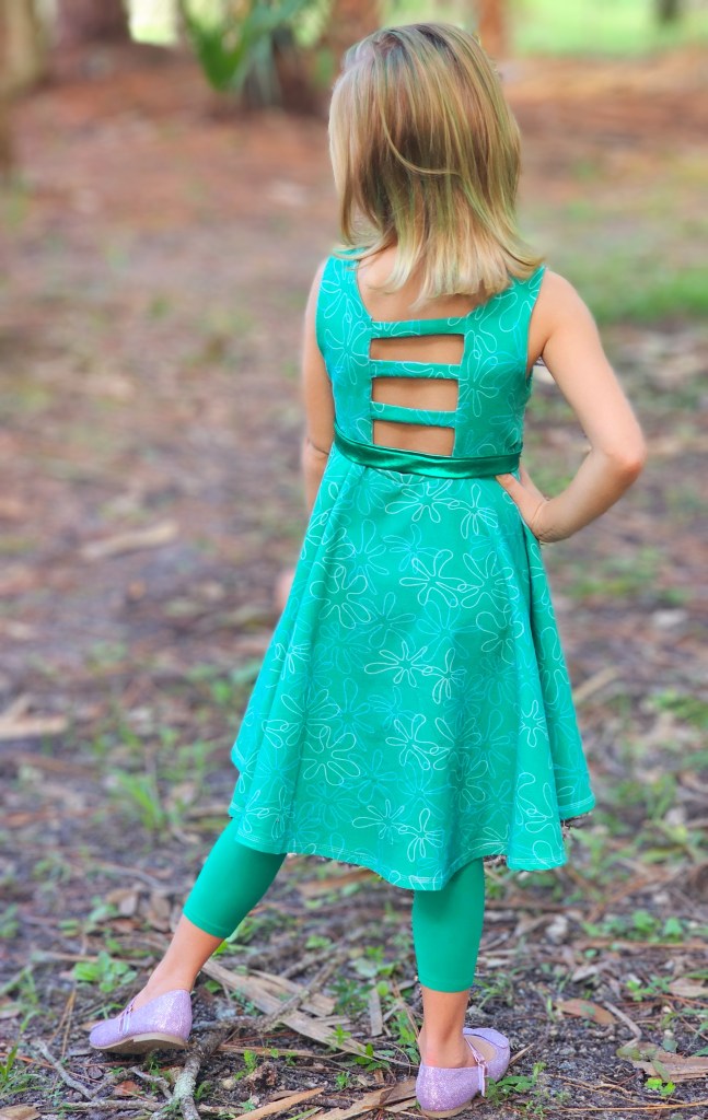 Finally, my for my daughter’s look I mashed the Raven and Dragonfly patterns from Boo & Lu. For her top I used the Dragonfly which comes with a top option and did not modify the pattern pieces. For her skirt I used the Raven pattern and cut at the natural waistline in the dress pattern piece to create a skirt instead of a dress and finished it by adding a waistband. To complete her look I added self-drafted sashes.