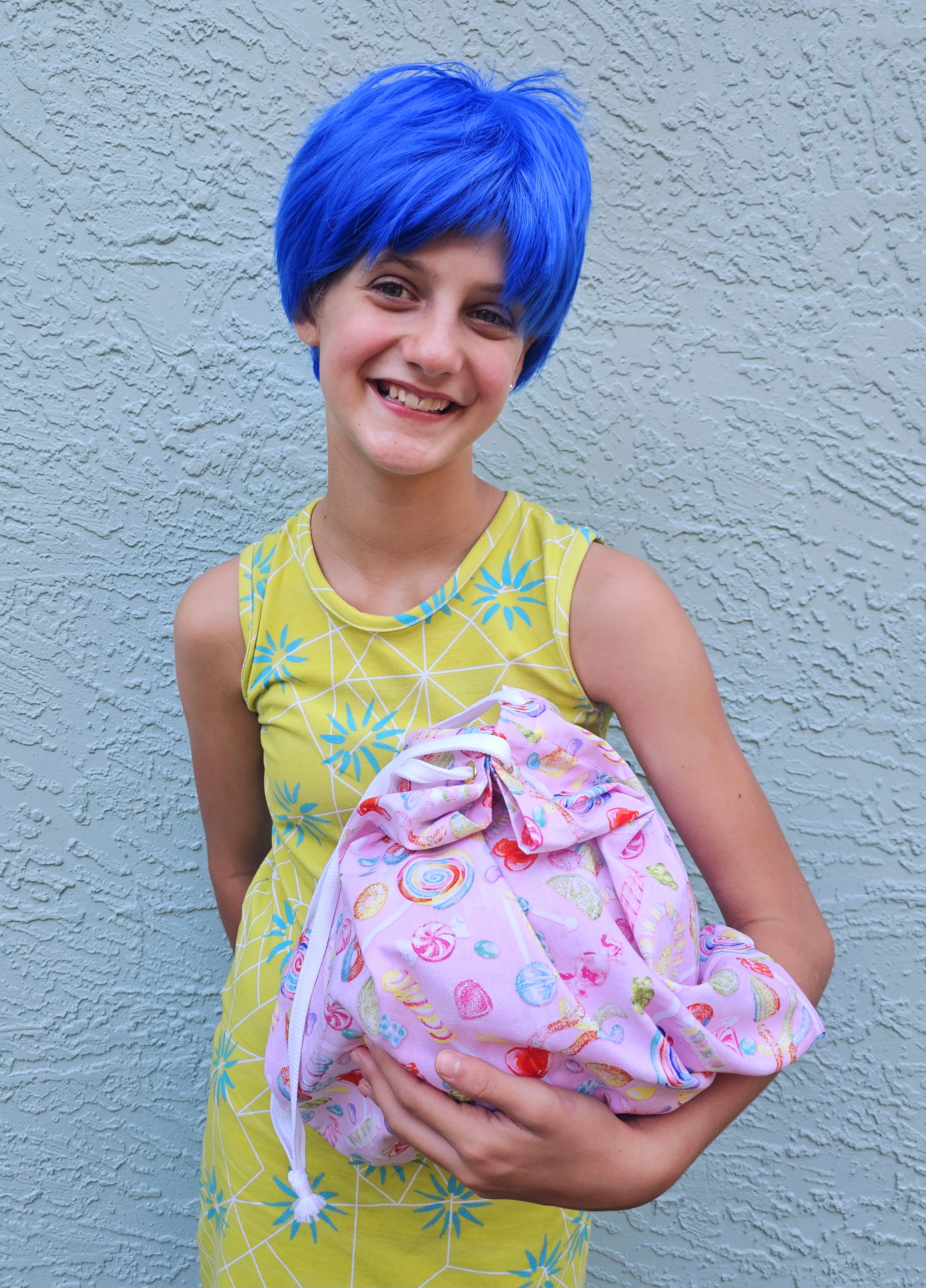 My daughter also asked me to re-create Bing Bong’s Bottomless bag to use as her trick or treating bag to match her costume. I loved her idea so much! I found similar candy themed fabric at Hobby Lobby and I wrote up a blog post for Simple Life with a free tutorial on a cinch bag using 2 different methods to complete her look. Now both girls have new trick or treat bags in the Inside Out theme. Head over here and check out the EASY and free tutorial to sew up your own cinch bag.