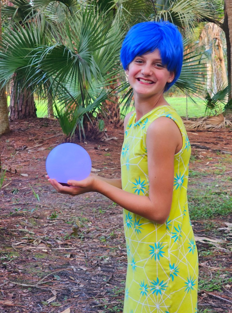 I used all Simple Life patterns for both costumes. I used the Quinn and Energize patterns for Disgust and Autumn for Joy. I used the simple version of Energize in the capri length and did the circle skirt (not high low version) of Quinn. I then added a quick belt using scraps of fabric, thick interfacing and a belt loop that I had on hand to match. For her neck scarf I upcycled the satin lining of a ripped up tutu in my girls’ dress up box. I also used the simple version of Autumn for Joy’s costume (which is by far the easiest costume I have ever sewn). To complete the look for Joy we bought an LED light (with remote) from 5 Below and a wig on Amazon. Both costume fabrics are from Purple Seamstress and were just perfect for re-creating these looks!