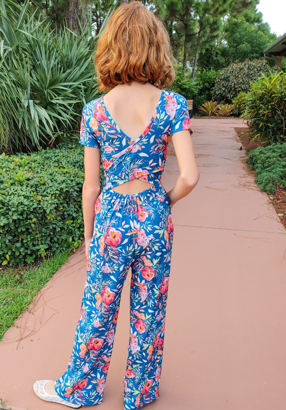 I wanted to sew up two completely different looks with this fabric to show just how versatile it is!  First, I sewed an Aaronica Romper from Made for Mermaids for my oldest daughter.  This pattern offers so many options including shorts, capri, pants and skirt as well as multiple sleeve lengths. The pants option make it perfect for transitioning to Fall but the short sleeves and back cut-out keep her cool enough in the waning summer heat as well. It is always a little tricky to sew for her since she’s so tall (same height as me now!) but so thin. I graded this pattern into a size 10 chest, size 8 waist and hips and a size 14 length. It was easier to grade than I expected but I did need to adjust the back elastic to be smaller for her. Once I adjusted the back elastic the romper fit her perfectly and is just so flattering on her!