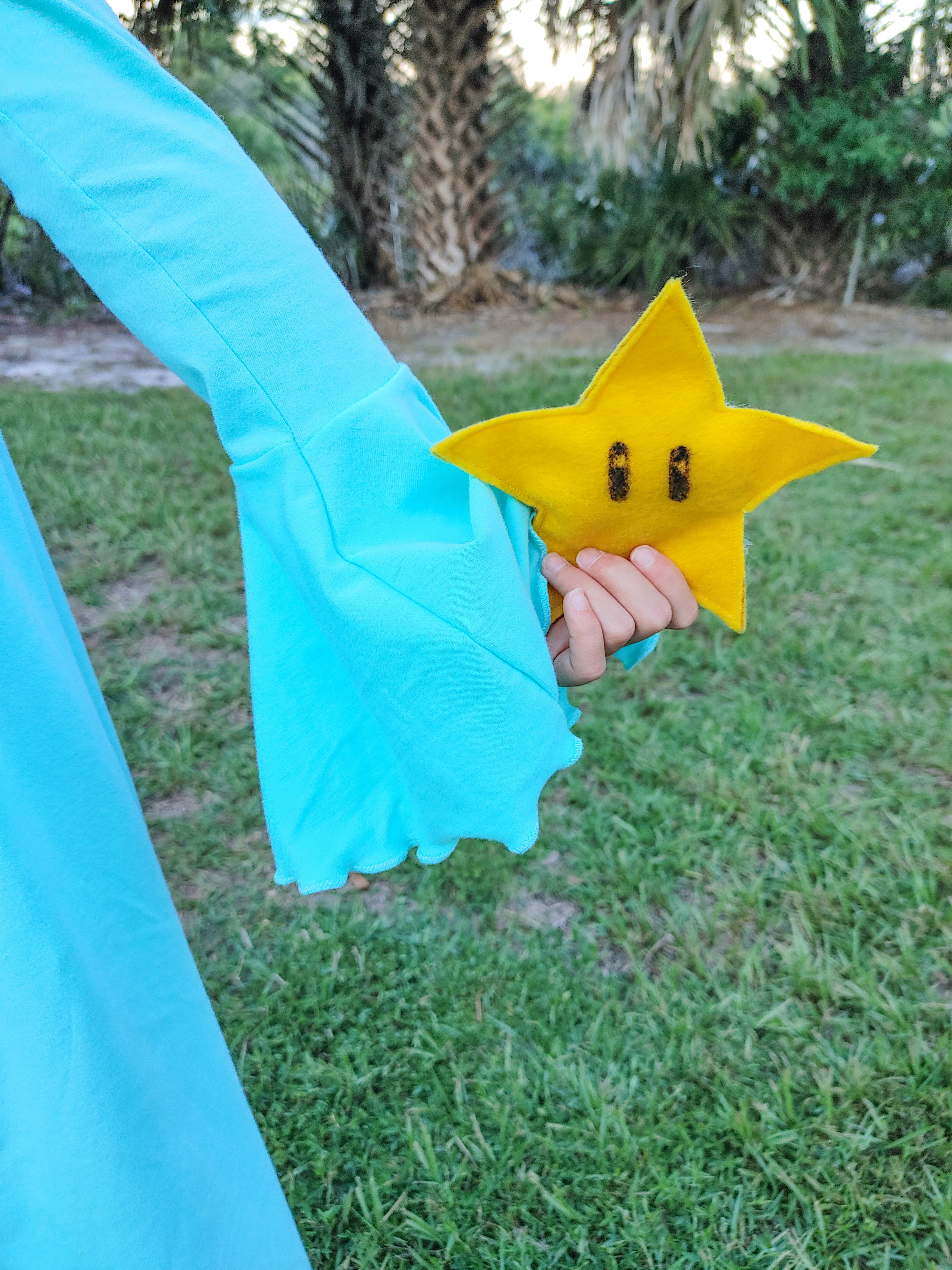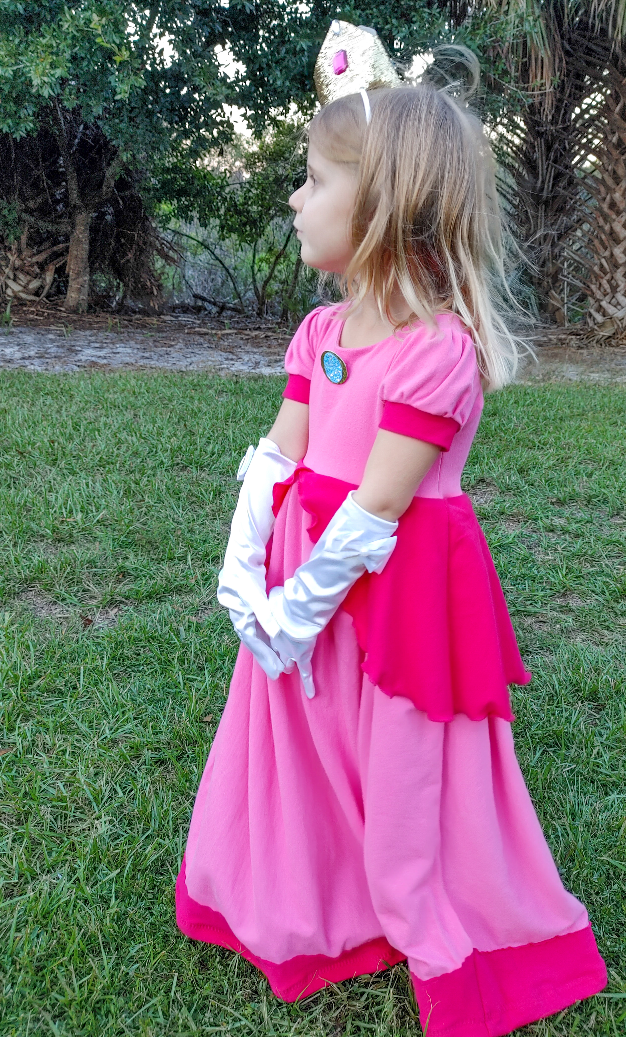 Next, my eight-year-old chose Rosalina as her favorite character.  The mint was the perfect color match for her inspiration, and we paired it with the white for her shawl.  This was such a fun costume to create as well, I mashed together a few patterns to create this look! First, I used the bodice from the Hibiscus Pattern from Petite Stitchery paired with the FREE bell sleeve add on. For the skirt, I used the maxi length Hampton from Simple Life Patterns. The front piece is cut mirrored (instead of on the fold) putting the “high low” side into the middle front seam and I added length to the back piece to give it more of a train look. For her shawl I used the over skirt pattern piece from the Diana pattern and modified it slightly to fit her shoulders and then pin closed. For both Rosalina and Peach’s crowns I used a crown template (Design ID 53108 in the Silhouette Store) cut on freezer paper with my Silhouette.