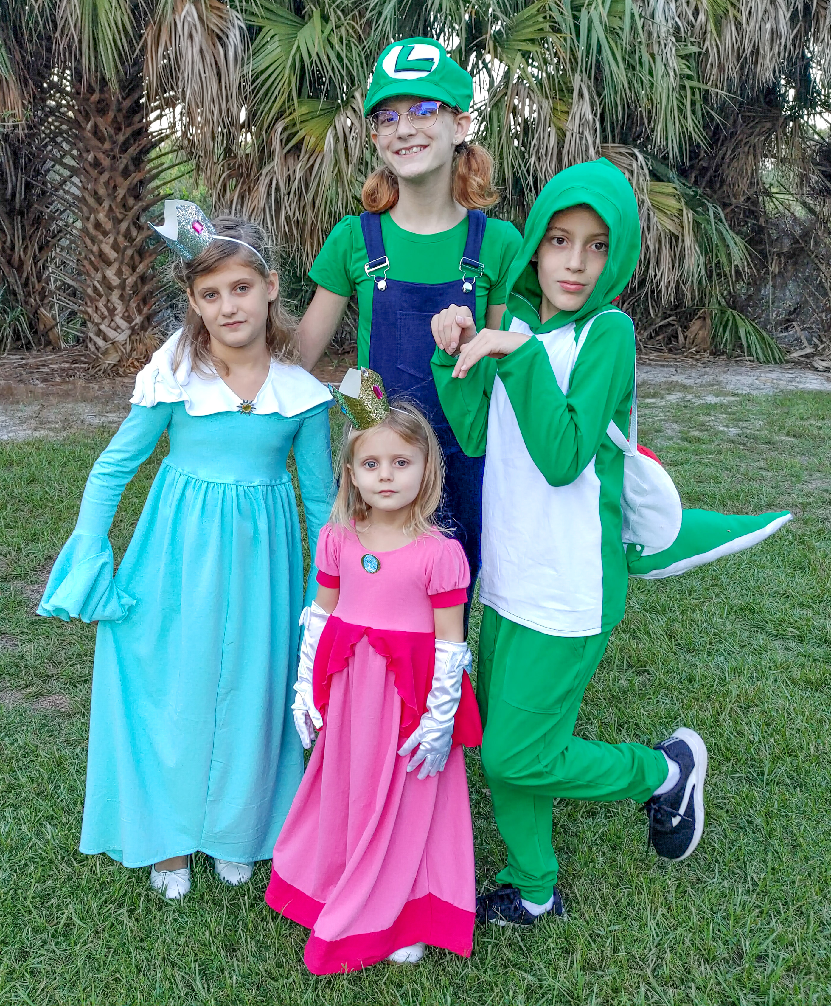 These characters were SO FUN to create and I loved seeing all the pieces come to life.  We chose Princess Peach, Rosalina, Yoshi, Luigi, Mario and Waluigi as our characters.  First, my youngest is a princess obsessed little one and wanted Princess Peach (of course!) as her costume.  I used the Bright Fuchsia Pink and Bright Bubblegum Pink for her costume. I used all pattern pieces from Simple Life Patterns and also blogged about this make here. So, head over to that SLPCO post to read all about how to create this princess themed look.