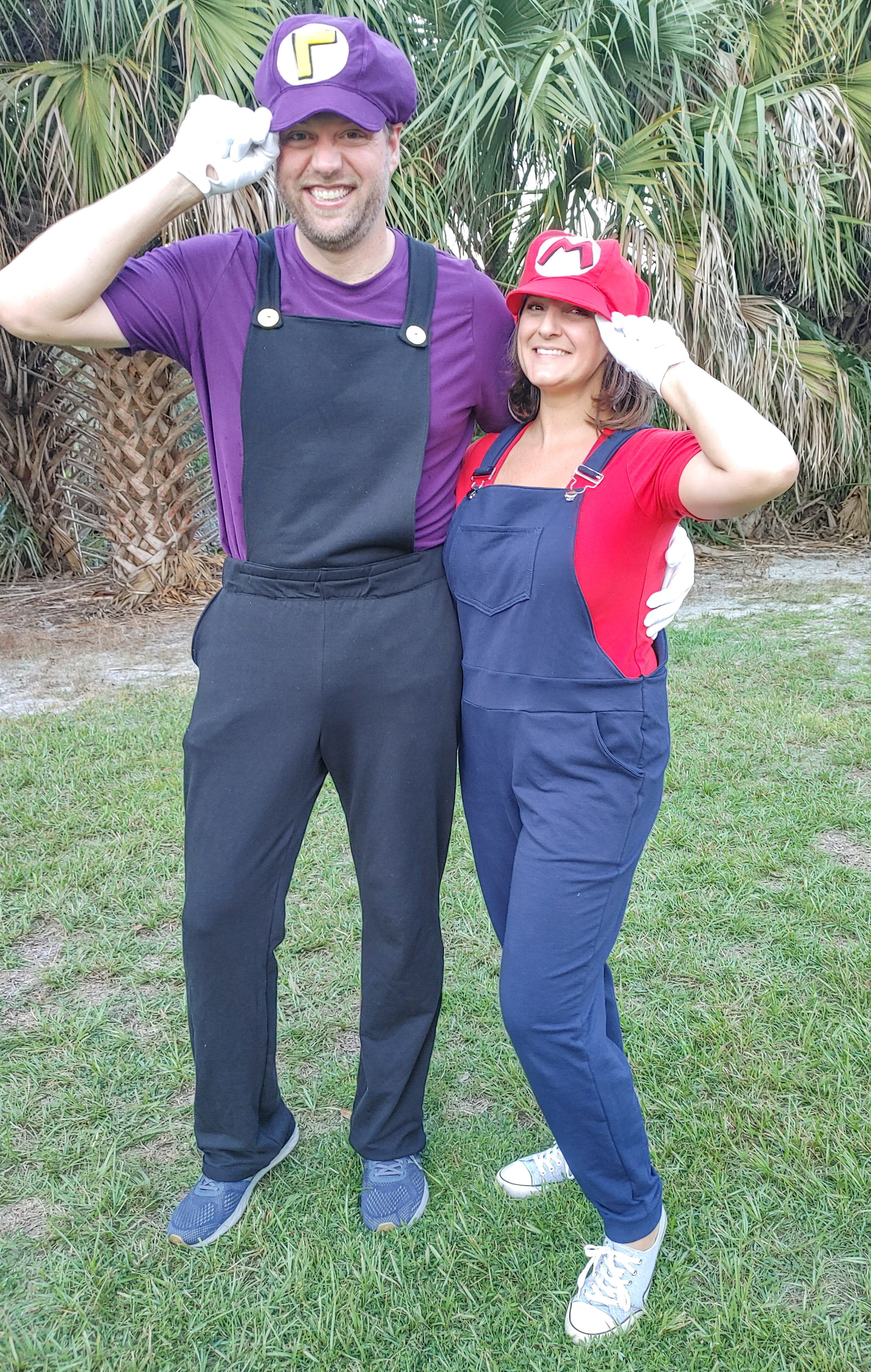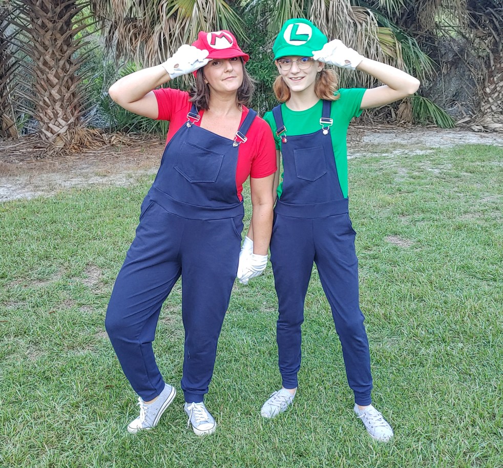 Finally, my husband and myself went with Mario and Waluigi for our costume choices!  I love that both of my pieces are completely versatile for everyday wear just like my daughter’s and will get tons of use in my closet. I also used the Zoey & Zeke Overalls from Made for Mermaids but paired mine with a Favorite Tee from Patterns for Pirates.  My husband can be *ahem* picky about his clothing and I was having a really hard time finding a knit pants pattern for him that wasn’t a jogger style. I finally found and decided on the Fit Pants from Mamma Can Do It. I am so happy I stumbled across this pattern as it is loaded with options for my hubby! I used the classic width and added length for his 6’3″ height. They turned out to be a perfect fit! Since I knew that he would not wear overalls on a regular basis I added a bib and strap to these pants after they were constructed. I simply measured how wide and tall I needed the bib to be while wearing the pants and attached them to the waistband. This way I can easily rip out the stitches after Halloween and he will have a super comfy pair of pants! I paired his overalls with the Straight Fit Basic Tee from Ellie and Mac. I used the same Newsboy Cap pattern for both of our hats and constructed them in the same method as the Luigi hat. We did have a mustache wardrobe malfunction so we just rolled with it anyway!