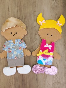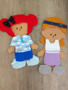 My kids all wanted a doll that resembled themselves and they turned out so cute! We used felt for the dolls and hair (please note the blond pigtails are purposely upside down to mimic my 2 year olds crazy pigtails in real life). The hair slides onto the top of the head for easy changing. For the clothing and shoes we used a mix of solid and patterned felt, glitter and patterned craft vinyl, craft foam and extra accents like ribbon, pom poms, buttons and bows. The clothes all attach with velcro so they are super easy to mix and match for tiny hands. They really remind me of playing with paper dolls as a child.
