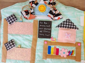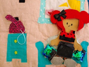 Once we finished our sets of dolls the kids asked to add more pages into our Dollhouse Quiet Book. Our book is already quite large at 8 pages but since the pages attach by velcro it is easy to add in more. Most of the traditional rooms already included in the pattern were already in our book so most of the additions are our own creations. We still used the pattern pieces for the pages and the bathroom but otherwise I really let the kids use their imaginations to create. We added in a bathroom, kids bedroom with bunk beds, laundry room and sewing/craft room (my favorite room!). I recently started sewing with a projector (LIFE CHANGING PEOPLE) and it came in handy with this too. I use Chrome Cast to cast my desktop onto the projector so I was able to pull up clipart of accessories (the sewing machine for example) and simply project the shape onto the fabric to get it the perfect size, traced it and then cut/sewed the pieces. It was so easy! Here’s a few pictures of the new pages we added in, I wasn’t able to dig up pictures of the rest of the book. The best part of this book is that is completely interactive, you can make as much (or as little) as you want removable via velcro, button, etc.